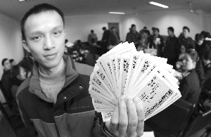記者在現(xiàn)場(chǎng)注意到,部分學(xué)生代表拿到同學(xué)們預(yù)訂的火車票后仍愁眉不展。環(huán)境學(xué)院07級(jí)碩士研究生石昕就拿著一疊票在登記表上核對(duì)、打鉤,不時(shí)嘆息。他們班26人訂票,只拿到了14張票,其余都沒有!安皇菦]票,是有票他們不要!笔空f,沒訂到票的同學(xué)多半是往重慶、哈爾濱等方向的,都是要求太高,指定要硬臥,坐票都不考慮。這讓火車站工作人員為了難,這些地區(qū)火車票本身就很緊,臥鋪票更加有限,非臥鋪不要的要求根本無法滿足。