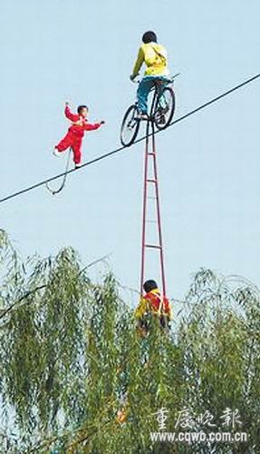 據(jù)了解,學(xué)走鋼絲的第一步是從單腳站磚頭開始,逐漸增加高度和難度。經(jīng)過這種循序漸進的訓(xùn)練,張婭很快掌握了低空走鋼絲技巧。經(jīng)指導(dǎo),她又學(xué)會在鋼絲上表演“金雞獨立”、“旋轉(zhuǎn)”、“平臥”等高難度動作。通常,走鋼絲表演者手里要拿東西保持平衡,可張婭學(xué)藝一年左右,就能做到空手走鋼絲,還能突然躺在鋼絲上“睡覺”和“起床”!