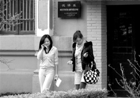 昨天下午4點(diǎn)46分,王亭亭站在北外的校門口,身邊跟隨著一位衣著時尚、戴著墨鏡的女士。幾個北外的學(xué)生當(dāng)即認(rèn)出了她,王亭亭身穿的粉色套裝和博客上的照片一模一樣,照片中染色的卷發(fā)已經(jīng)拉直并且染成黑色,表情有些冷漠,并不顧及旁人的目光,低頭直接走進(jìn)離北外校門不足200米的德語系辦公樓。