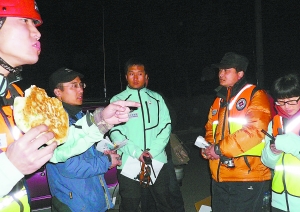 昨天晚上,當記者來到北京市植物園西門的時候,門旁邊的花池子邊上,放著救援隊員帶來的烙餅、鴨脖子、雞腿,還有成箱的礦泉水,下午4時出發(fā)前兩組隊員剛剛返回,很多人因為上山前未吃飯都開始“狼吞虎咽”。