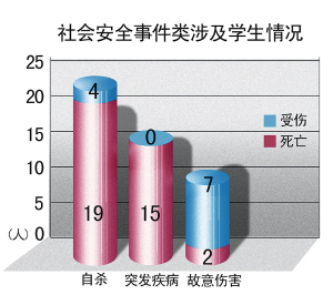自殺 2008年高校共發(fā)生社會(huì)安全類事件45起(見圖二),涉及學(xué)生47人,造成36人死亡,11人受傷。其中居首位的是自殺事件,共23起,造成 19人死亡,4人未遂;15名大學(xué)生因突發(fā)疾病死亡,主要由于心臟、哮喘等疾病所致;校內(nèi)外故意傷害事件7起,造成2名學(xué)生死亡7人受傷,其中5起為三人以上的斗毆事件。