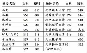 昨天(10日),本市高招一批錄取工作正式開始,17所高校分別確定了在京調(diào)檔線或?qū)嶋H錄取線。其中北京大學的文科調(diào)檔線為626分,超過清華4分;理科調(diào)檔線650分,比清華低6分。