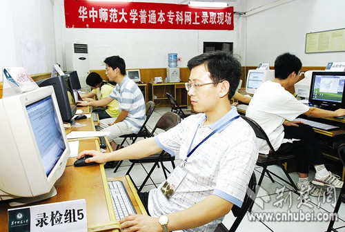今年在全國高校中,華中師范大學(xué)是唯一一所所有專業(yè)均在湖北提前批次錄取的高校。昨晚9時,記者在華中師范大學(xué)2008年高招錄取現(xiàn)場看到,該校數(shù)臺高招錄取專用電腦已全部就位,多名招生人員正緊張地守在錄取電腦前,進行接收投檔前的各項準(zhǔn)備工作。