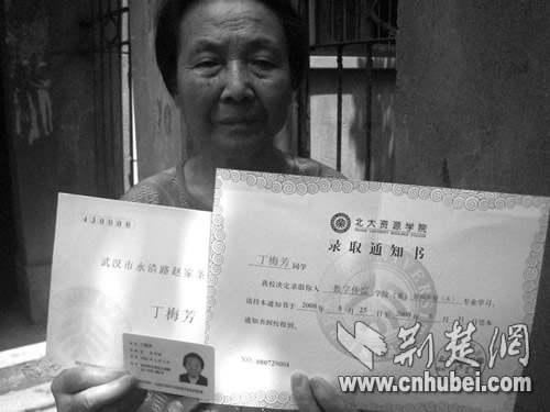 昨日(8月5日,下同)上午,家住漢口永清街趙家條的丁梅芳老太向記者展示了這封標稱“北大資源學院(以下簡稱北資院)”,在8月3日寄達的錄取通知書。記者看到,該錄取通知書上寫著:“丁梅芳同學,我校決定錄取你入數(shù)字傳媒學院系新聞傳播(本)專業(yè)學習,請持本通知書于2008年8月25日……到校報到!