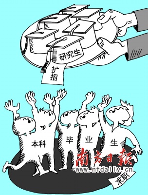 據(jù)悉,2009年全國將有610萬應(yīng)屆畢業(yè)生,其中廣東高校畢業(yè)生人數(shù)達(dá)到33.1萬人。截至3月10日,廣東省普通高校本科畢業(yè)生簽約率僅為 7.61%,而去年同期大學(xué)畢業(yè)生和?茖W(xué)校畢業(yè)生的簽約率約為60%!皣(yán)峻的就業(yè)形勢下,教育部門出臺研究生大幅擴(kuò)招的計劃,很明顯就是有‘分流’的意味!
