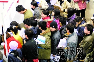 沒看到一個心儀的單位,吳婷在洶涌的人潮中覺得很是失望。但是她覺得要對得起花出去的10塊錢門票。她不顧自己淑女的風范,擠到了一個還算過得去的單位攤位前,盡管此時她已經(jīng)挨了別人好幾腳,同時她的細高跟也“踐踏”了幾個人,“什么都不管了,就將簡歷塞到了那家單位負責人手里,連一句客套話都沒有講就被擠出來了!