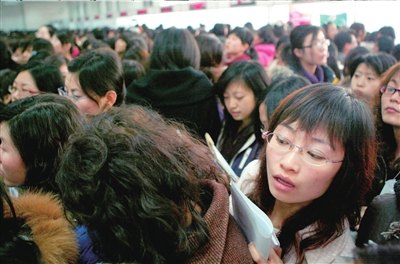 昨天(4日)上午9點,女大學(xué)生專場招聘會在北京市畢業(yè)生就業(yè)市場舉辦。此次招聘會共有50家企事業(yè)單位參加,600個崗位提供給前來應(yīng)聘的女大學(xué)生。市人事局畢業(yè)生就業(yè)服務(wù)中心統(tǒng)計,截至下午2點招聘結(jié)束時,約5000人參加招聘,平均8人爭取1個崗位。