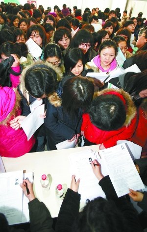 現(xiàn)場(chǎng)50多家用人單位提供的崗位基本都很適合女生,如銷(xiāo)售員、會(huì)計(jì)、文秘、客戶(hù)代表等。但也許是受到性別的約束,盡管崗位有600多個(gè),熱門(mén)單位卻幾乎沒(méi)有!耙环莺(jiǎn)歷都沒(méi)投出去!睂W(xué)刑事執(zhí)行專(zhuān)業(yè)的北京政法職業(yè)學(xué)院的一名應(yīng)屆畢業(yè)生告訴記者,由于所學(xué)專(zhuān)業(yè)窄,除了參加公務(wù)員考試,幾乎每場(chǎng)招聘會(huì)都去,但對(duì)口的單位非常少。
