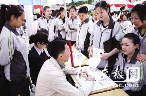 在現(xiàn)場記者還發(fā)現(xiàn)了一個有趣的現(xiàn)象,同樣的校服往往“成堆”出現(xiàn),甚至一個攤位前站的十幾個人穿的都是一色的衣服。專業(yè)相同、關(guān)系較好的同學(xué)一起求職可以理解,但卻是求職時的一個禁忌,容易給用人單位留下獨(dú)立性不強(qiáng)的感覺。不過昨天會場的企業(yè)卻對此不太在意,“畢竟招聘會特殊,崗位需求也較多,同類學(xué)生在一起有個比較,作為未來同事特別是實(shí)習(xí)階段,相互間比較熟悉也沒壞處!币患揖频曦(fù)責(zé)人這樣解釋。