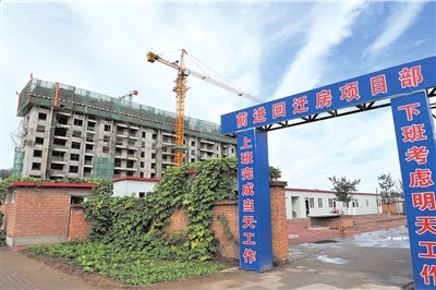 9月21日上午,記者驅車趕往太平村原址。在順義區(qū)北二環(huán)路南側,記者看到,十余棟高樓已經(jīng)拔地而起,外部的墻體結構均已經(jīng)建設完畢,但尚未粉刷。在工地的入口處,清晰地寫著“回遷房”等字樣。據(jù)工人們稱,工程是從年后開始的,曾經(jīng)在4月前后停了一段時間,后來又開始復工。
