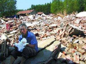 9月15日,山東諸城枳溝二村,一名農(nóng)民在瓦礫上吃午飯。他當(dāng)天在整理建筑垃圾,尋找可用的材料。本報記者 涂重航 攝