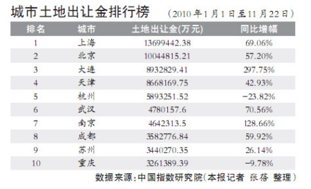 今年雖然遭遇史上最嚴(yán)厲的房地產(chǎn)調(diào)控,但各大城市的土地出讓金卻出現(xiàn)大幅提升。中國(guó)指數(shù)研究院的數(shù)據(jù)顯示,截至11月22日,上海土地出讓收入以1369.94億元高居榜首,北京以1004.48億元位列第二,大連以893.28億元位居第三,去年排在第一位的杭州今年跌出前三,僅收入589.33億元(詳見附表)。值得注意的是,十大城市中,只有杭州和重慶的土地出讓金出現(xiàn)了同比下降的現(xiàn)象,其余城市的出讓金則大幅增加,增幅最大的是大連,比去年同期增長(zhǎng)了297.75%,增幅最小的蘇州也達(dá)到了26.14%。