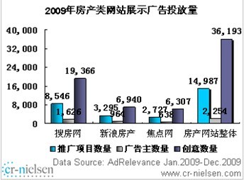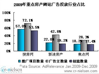 尼爾森《2009中國房地產(chǎn)網(wǎng)絡(luò)廣告市場研究項(xiàng)目報(bào)告》顯示,2009年中國互聯(lián)網(wǎng)房地產(chǎn)行業(yè)展示類廣告推廣項(xiàng)目總量為14987,廣告主總量為2254,創(chuàng)意總量為36193,三項(xiàng)指標(biāo)中搜房網(wǎng)分別占據(jù)了行業(yè)整體的57%、72%、53.5%。報(bào)告分析指出,房地產(chǎn)網(wǎng)絡(luò)展示廣告投放TOP3網(wǎng)站分別為搜房網(wǎng)、新浪房產(chǎn)和焦點(diǎn)網(wǎng),除搜房網(wǎng)以較大優(yōu)勢領(lǐng)先外,新浪房產(chǎn)與焦點(diǎn)網(wǎng)的展示廣告投放水平競爭膠著,新浪房產(chǎn)覆蓋房產(chǎn)行業(yè)42.8%的廣告主,焦點(diǎn)網(wǎng)約占三成,兩家網(wǎng)站房地產(chǎn)展示推廣項(xiàng)目數(shù)與創(chuàng)意數(shù)水平基本相當(dāng)。