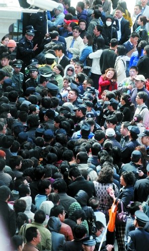 昨日中午,千余人排起“U”形隊(duì)伍,警察在現(xiàn)場(chǎng)維持秩序。隊(duì)伍當(dāng)中,一些小商販在兜售小凳子,還有送外賣的人圍著人群轉(zhuǎn)了幾圈,不知從哪能擠進(jìn)去。一位現(xiàn)場(chǎng)保安稱,臨時(shí)用透明膠帶代替警戒線,以免發(fā)生踩踏。