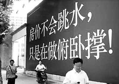 這種房產(chǎn)廣告,不禁讓人聯(lián)想起之前在南京中央大道推出的另一個巨幅樓盤廣告:“房價不會跳水,只是在做俯臥撐!倍咚悸啡绯鲆晦H,都是利用網(wǎng)絡熱門流行語來博出位、吸引眼球,從而達到促銷的目的。