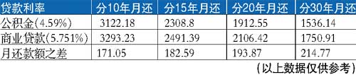 以貸款30萬元為例,采取等額本息還款法,采用公積金貸款和商業(yè)貸款,其月還款額對比為:(單位:元)