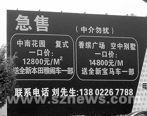 最大的一塊廣告牌矗立在白石路與科苑南路交匯處的西南側(cè),約10平方米大小,黑白分明的底色,端端正正的橙色粗體字格外引人注目!凹笔邸弊謽酉掠袃蓚橢圓形框,框內(nèi)寫明了具體出售內(nèi)容,一個是“中南花園,復(fù)式,一口價:12800元/平方米,送全新本田雅閣車一輛”,另一個是“香繽廣場,空中花園,一口價:14800元/平方米,送全新寶馬車一部”。廣告牌下端還留下了業(yè)主劉先生的手機(jī)號碼,并特別注明“中介勿擾”。