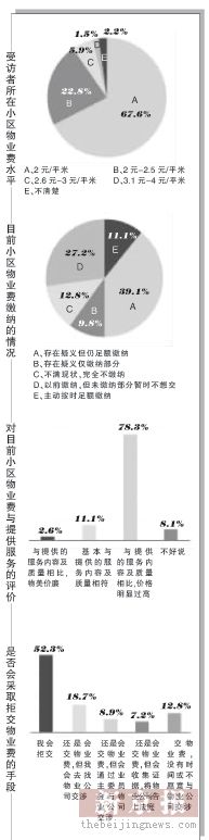 問卷顯示,豐臺區(qū)三環(huán)新城、昌平區(qū)天通苑、龍澤苑、朝陽區(qū)國美第一城均有業(yè)主大范圍拖欠物業(yè)費的現(xiàn)象和相當一部分業(yè)主拒交物業(yè)費的現(xiàn)象。