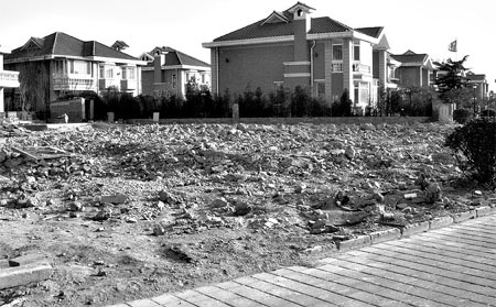 一片瓦礫、紅磚碎片,角落里并肩躺著4個(gè)抽水馬桶,旁邊堆著200多塊路牙石,曾經(jīng)小區(qū)里惟一聯(lián)排的別墅蕩然無存,與周圍紅墻藍(lán)瓦的整體風(fēng)貌格格不入。2月22日,記者獲準(zhǔn)在北京國際花園看到的這片廢墟,“造價(jià)”超過千萬。