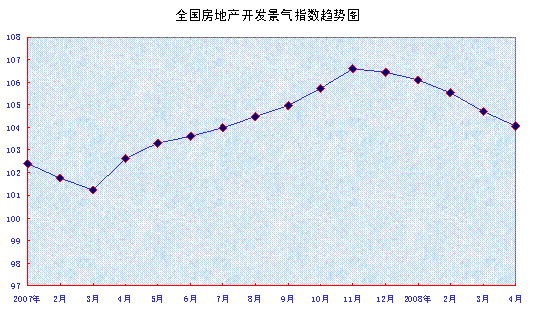 中新網(wǎng)5月16日電 據(jù)中國國家統(tǒng)計(jì)局網(wǎng)站消息,4月份,“國房景氣指數(shù)”為104.07,比3月份回落0.65點(diǎn),同比上升1.42點(diǎn)。