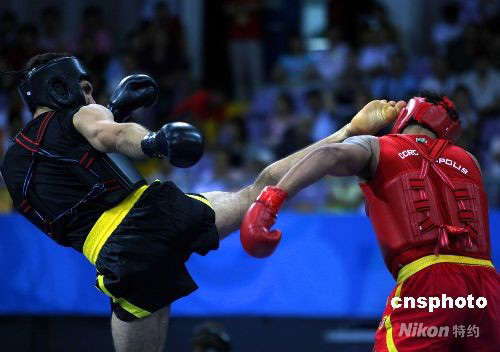 8月23日下午,在北京2008武術(shù)比賽男子散手70公斤級較量中,伊朗選手侯賽因·奧賈吉(黑方)戰(zhàn)勝巴西選手埃默松·諾蓋拉·阿爾梅達(紅方)。中新社發(fā) 宋吉河 攝