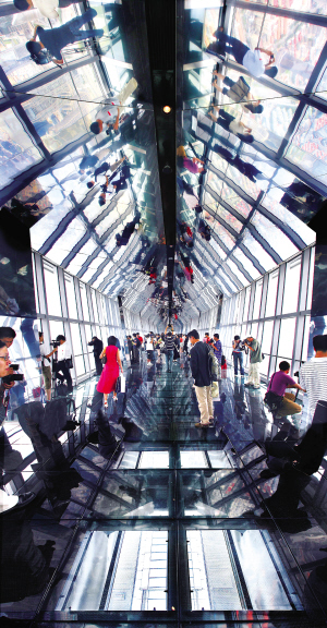 再轉(zhuǎn)乘專用電梯,終于來到位于100層、距地面474米處的“觀光天閣100”。這是目前世界最高的觀光設(shè)施。55米長的懸空觀光長廊,其實就是大廈頂部倒梯形風洞的上檐,三角形屋頂鑲滿玻璃鏡面,光影折射夢幻迷離。長廊地面鋪有3條透明玻璃地板,可直接俯瞰腳底下陸家嘴金融貿(mào)易區(qū)川流不息的車流、芳草如茵的綠地及連綿的樓宇,對膽量是一種小小的考驗?zāi)!難怪在轉(zhuǎn)乘電梯時,顯示屏播放的內(nèi)容為:玻璃地板的安全性能。