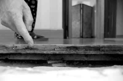 “距我們反映主衛(wèi)門框下面滲水、造成主臥的地板部分褪色、門框底框腐爛、門套底部貼面有氣泡突起、地磚大面積發(fā)黃這些問題已經(jīng)一個月了。有人來看過也說是‘防水沒做好’,但沒單位負(fù)起這個責(zé),徹底解決這件事,只是互相推諉。作為弱勢群體的我們只能不停地反映、等待。現(xiàn)在被挖開的地方,每天都會有小蟲爬出來。哎,花600多萬買的房子,浴缸卻只能看不能用。 ”陳老先生的老伴邊說邊指著旁邊畚箕里她掃出來的黑色小蟲子。對此,物業(yè)部門也派人檢查了好幾次。