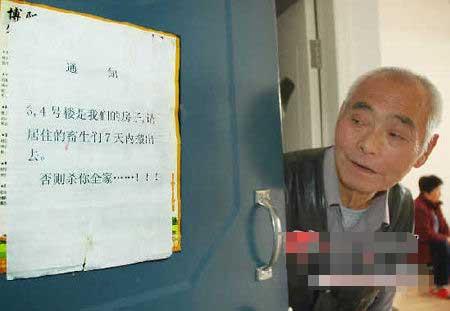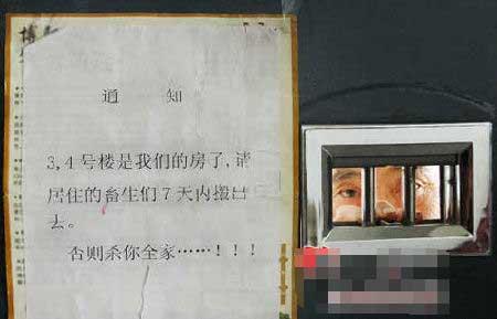 該小區(qū)物業(yè)辦工作人員說,十天前,小區(qū)里突然出現(xiàn)了十幾張通知,落款未寫單位,但內(nèi)容很恐怖:如果三、四號樓的住戶不搬家,就殺他全家!罢麄小區(qū)的人都人心惶惶的,特別是三、四號樓的200多個住戶,日夜守在家里,生怕沒人的時候房子被人強占。”該工作人員說。