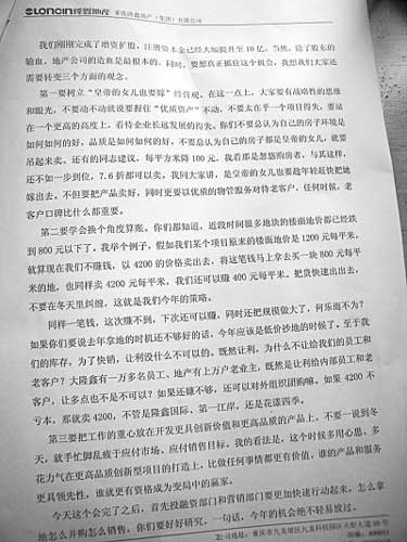 隆鑫地產(chǎn)一位不愿意透露姓名的高層領(lǐng)導(dǎo)向記者透露,其實這份講話稿是刪減后版本,這份整理后的講話內(nèi)容,主要是給隆鑫地產(chǎn)公司的經(jīng)理以上、副總經(jīng)理級別以下的人學(xué)習(xí)并領(lǐng)會精神,而只有幾個核心層領(lǐng)導(dǎo)參與的內(nèi)部會議,完整版里面降價的方案多達7種。