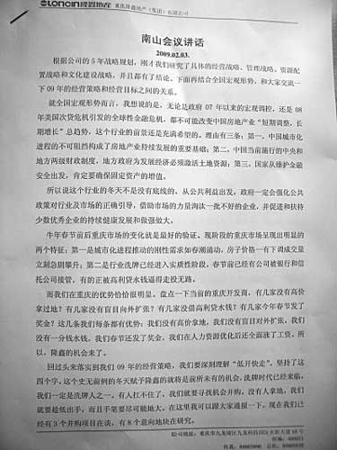 昨日,重慶一網(wǎng)友自稱貼出隆鑫地產(chǎn)一份高層內(nèi)部南山會議講話稿的照片,其稱在春節(jié)后,隆鑫地產(chǎn)欲對旗下樓盤降價,以期快速回籠資金去買地擴張規(guī)模。從內(nèi)容上看,講話者像是為隆鑫降價做動員工作,表明降價的目的是快速回籠資金并擴大規(guī)模。網(wǎng)友在跟帖中稱,萬科松山湖會議紀(jì)要事件驚現(xiàn)重慶版,隆鑫降價講話遭網(wǎng)絡(luò)泄密。隆鑫地產(chǎn)一位不愿意透露姓名的高層告訴記者,內(nèi)部正在追查泄密者。