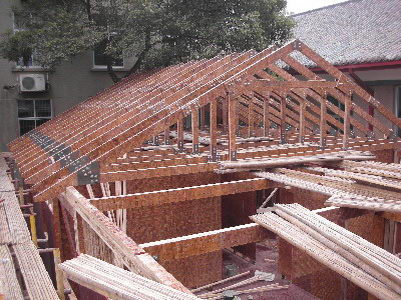據(jù)介紹,竹結(jié)構(gòu)住宅所用的結(jié)構(gòu)構(gòu)件和連接件都是采用工廠標(biāo)準(zhǔn)化生產(chǎn),蓋房子就像搭積木一樣。施工過程類似于北美的平臺式輕型木結(jié)構(gòu)住宅施工,其樓蓋和墻體分開建造,因此已建成的底層樓蓋可以作為上部墻體施工時的工作平臺。通常墻體骨架可在工作平臺上拼裝,然后人工抬起就位。墻體也可在其他地方先拼裝好,再運(yùn)到施工現(xiàn)場就位。