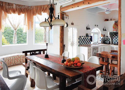 玄關(guān)是室內(nèi)的第一視覺(jué)焦點(diǎn),小米用藍(lán)白兩色為這個(gè)家點(diǎn)了題,與房子的外立面呼應(yīng):白色的墻面,藍(lán)色的門板、鞋柜、天鵝頭木盆描繪著浪漫的地中海風(fēng)情;客廳里條紋圖案的布藝沙發(fā)和花朵圖案的布藝貴妃椅則是典型的鄉(xiāng)村風(fēng)格,主題墻上點(diǎn)題式地掛起兩幅與海岸相關(guān)的油畫;餐廳里,小米玩起了混搭——上等老榆木的厚重餐桌,兩頭各放一張老榆木餐椅,氣勢(shì)穩(wěn)重,兩側(cè)則是四張?jiān)O(shè)計(jì)感很強(qiáng)的白色Panton椅,起初你會(huì)覺(jué)得有點(diǎn)大膽,再認(rèn)真審視,又覺(jué)得這種碰撞很和諧,小米說(shuō):“我喜歡來(lái)點(diǎn)驚喜的感覺(jué),這椅子的線條很優(yōu)美,像海浪般起伏,與老榆木的感覺(jué)一個(gè)新,一個(gè)舊,一個(gè)輕,一個(gè)重,相映成趣。”