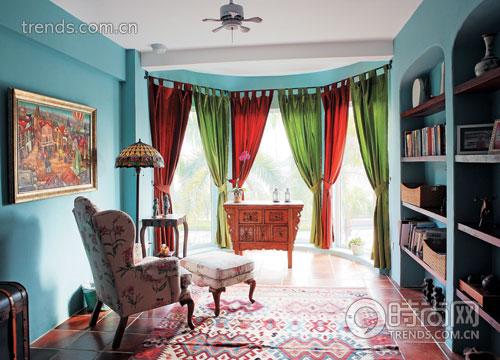 二樓開(kāi)放式會(huì)客偏廳,也是擺放飾物最多的一角,色彩的運(yùn)用恰到好處。