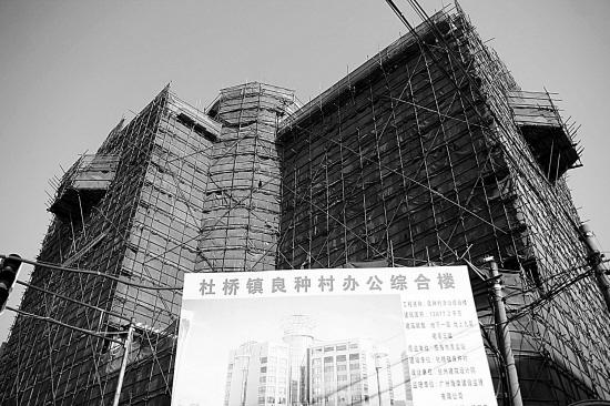 說(shuō)它是熱帖,準(zhǔn)確地說(shuō)其實(shí)就是一組照片。照片中,一幢大樓拔地而起,主體框架已搭建完畢,不過(guò)由于尚未完工,整幢大樓像是穿上了一層漁網(wǎng)服。大樓底下立著一塊規(guī)劃牌,最上面寫(xiě)著“杜橋鎮(zhèn)良種村辦公綜合樓”,中間是大樓的效果圖,9層高的大樓看上去頗為壯觀。