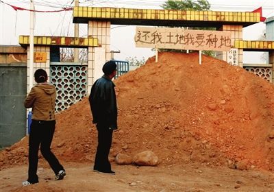 認(rèn)為村委會(huì)未按照占地時(shí)的承諾為其置換土地,14日晚,村民靳先生雇車運(yùn)來黃土,堵住豐臺(tái)區(qū)長辛店鎮(zhèn)大灰廠村村委會(huì)的大門。