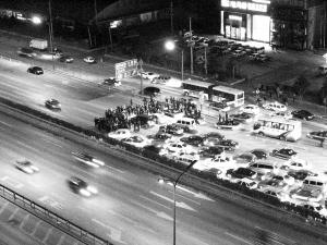 由于抗議小區(qū)旁建設(shè)變電站未獲進(jìn)一步回應(yīng),前晚10時(shí)許,望京南湖西園數(shù)十業(yè)主走上北四環(huán)東路,排成人墻封堵主路,前后持續(xù)十余分鐘。朝陽(yáng)警方出動(dòng)24輛警車和數(shù)十警力控制局面,并將20余人帶走調(diào)查。