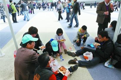 鴨脖子、雞爪、雞翅、黃瓜、雞蛋、面包……下午五點(diǎn)多,記者在園區(qū)看到,不少游客一家人攤開折疊椅,拿出包內(nèi)的食物開始野餐。沒吃一會(huì),女主人又買來4支冰激凌和若干串烤肉,一家人邊啃烤肉邊吃冰激凌,非常開心。 “我們一家人從江西南昌過來,早就聽說世博園內(nèi)到處都要排隊(duì),所以索性從家里帶了點(diǎn)吃的東西過來,主要是為了節(jié)約排隊(duì)用餐時(shí)間。”女主人邊說邊向記者展示她帶的食物。