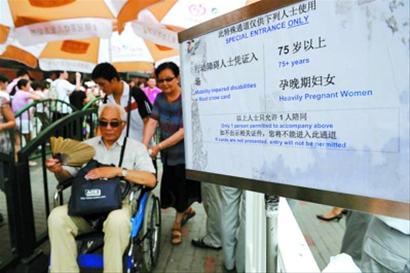 從今天(1日)起,世博園里75歲的老年人和行走不便的殘疾人享有走綠色通道的權(quán)利,而原先不少場館對孕婦和三四歲以下的兒童開放的綠色通道,從今天起不再適用。記者上午在世博園里看到,有一位孕婦模樣的游客欲走綠色通道時,被工作人員婉拒。