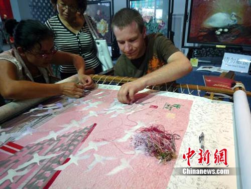 中新網(wǎng)上海7月20日電(肖前輝 劉吉科)入駐上海世博園寶鋼大舞臺(tái)“中國(guó)元素活動(dòng)區(qū)”傳習(xí)區(qū)表演半個(gè)月以來(lái),湘繡以其神奇的針法和快樂的參與性受到世博游客的熱捧。截至7月20日,已有來(lái)自世界各地的上千名觀眾參與了刺繡。
