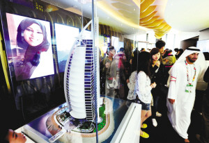 沿著時光隧道般的過道,古老的阿聯(lián)酋慢慢展現(xiàn)在參觀者眼前。阿聯(lián)酋的大學生志愿者們穿著傳統(tǒng)的服飾向游人問好,仿佛來自遠古的駝鈴聲回蕩在耳邊。移步換景,在現(xiàn)代館內,參觀者恍如換了個世界,看到的是利用視聽技術營造的現(xiàn)代阿聯(lián)酋,它有著快速發(fā)展的城市環(huán)境,有讓世界矚目的建筑和風景,還有豐富多彩的時尚文化。