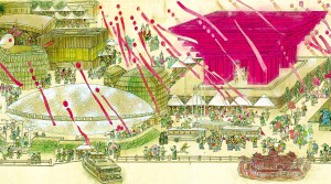 在中國館省區(qū)市館入口處,這幅長21米、寬0.47米的繪畫作品吸引了每一個經過的人。畫卷描繪了浦江兩岸世博園區(qū)內所有的場館以及近7000個游人,畫面上南浦、盧浦大橋橫跨兩岸,路上車輛、江面游輪、空中飛艇往來繁忙,園區(qū)內形形色色的建筑中間人流熙熙攘攘,一派熱鬧繁華的景象。有意思的是,長卷不僅展現(xiàn)了世博園區(qū)恢宏的場景,還刻畫了許多生動的細節(jié),如畫中有兩個孩子在沖向他們喜歡的場館途中,男孩的帽子被風吹走了;一對情侶在深情擁吻;“小白菜”勸說躺在長椅上睡覺的參觀者等。