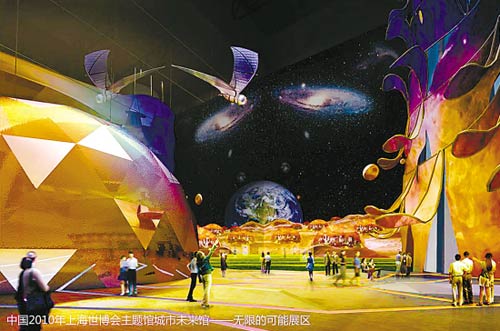 城市未來館的設(shè)計(jì)師重點(diǎn)推薦“未來就在這里”和“無限的可能”兩個(gè)展區(qū)!拔磥砭驮谶@里”展區(qū)是一個(gè)動(dòng)態(tài)城市模型的舞臺(tái)。“無限的可能”將在“和諧廣場”上,放映暢想未來城市的各種可能性的動(dòng)畫電影。