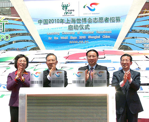 在東方明珠廣場,1500多位曾在上海舉辦的歷次重大活動中奉獻(xiàn)愛心的志愿者和各界市民代表齊集于此,參加世博會志愿者招募工作啟動儀式。啟動儀式前,上海市領(lǐng)導(dǎo)與志愿者代表們一起觀看了在北京天安門廣場舉行的中國2010年上海世博會天安門計時牌揭幕儀式的現(xiàn)場直播。上海市人大常委會主任劉云耕,上海市政協(xié)主席馮國勤,中共上海市委副書記、市文明委常務(wù)副主任殷一璀,上海市副市長、市迎世博600天行動城市管理指揮部總指揮沈駿共同開通了世博會志愿者招募網(wǎng)站報名系統(tǒng),全市72個志愿者工作站和上海世博志愿者網(wǎng)等6家網(wǎng)站同時開始面向社會接受志愿者的報名。中共上海市委常委、宣傳部長、市世博會籌辦工作領(lǐng)導(dǎo)小組志愿者組組長、市迎世博600天行動社會動員指揮部總指揮王仲偉發(fā)表致辭,歡迎廣大市民和國內(nèi)外人士踴躍參與上海世博會的志愿服務(wù)工作。中共上海市委常委、浦東新區(qū)區(qū)委書記徐麟,市人大常委會副主任王培生,市政協(xié)副主席、世博會執(zhí)委會副主任周漢民共同為世博會志愿者自行車宣傳隊授旗。