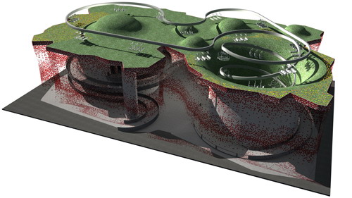 據(jù)了解,瑞士館主體結(jié)構(gòu)由兩個(gè)承重的大小圓柱和綠草如茵的屋頂組成,館內(nèi)底層展廳營(yíng)造的都市空間和館頂?shù)淖匀豢臻g相互呼應(yīng),觀光纜車帶領(lǐng)參觀者往返其間,給人以身臨其境,在城市和鄉(xiāng)村之間優(yōu)游的美好感受。瑞士館另一大亮點(diǎn)是其互動(dòng)閃光的帷幕外墻,將由半透明的鋁網(wǎng)結(jié)構(gòu)帷幕覆蓋,11000塊包含敏化太陽(yáng)電池的的生物樹脂懸掛其上,與展館周圍的能量如陽(yáng)光和相機(jī)的閃光發(fā)生反應(yīng),整個(gè)外墻呈現(xiàn)一種動(dòng)態(tài)閃光的視覺效果,以此展示能源的利用。