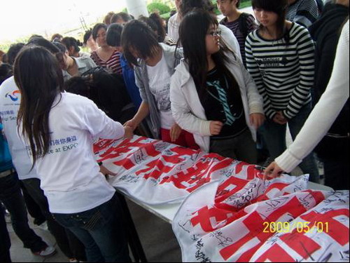 活動(dòng)現(xiàn)場(chǎng),學(xué)生們踴躍報(bào)名并在“思博學(xué)子爭(zhēng)做世博志愿者”橫幅上簽名留言,表達(dá)了愿為世博服務(wù)的決心。