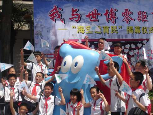 在“海寶”揭幕儀式上,學(xué)生代表表示,要努力學(xué)文化、學(xué)知識(shí)、學(xué)禮儀,從身邊的小事做起,積極行動(dòng),迎接世博、奉獻(xiàn)世博。