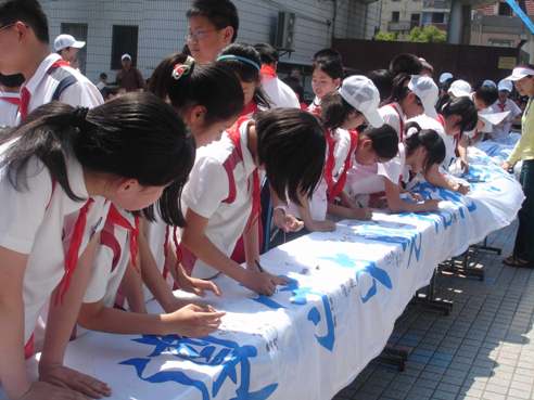 活動(dòng)現(xiàn)場,師生們一起在“世博文明公約”橫幅上簽名承諾,并在“我的世博心愿卡”上放飛祝福。