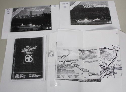 下面我分別談這兩件事的情況。當(dāng)我抵加拿大溫哥華,哥哥們 一定要我去參觀舉世矚目的1986年溫哥華世博會(huì)(EXPO),親友們很快為我購(gòu)買了精致的入場(chǎng)券。因?yàn)槊看稳ビ密囕d我參觀,一參觀一整天(從上午10點(diǎn)到下午9點(diǎn)),我只去過(guò)兩次,去幾個(gè)國(guó)家地區(qū),每到一個(gè)地區(qū)、國(guó)家可蓋紀(jì)念章。這張入場(chǎng)券像一本護(hù)照,做得很精致,同時(shí)各個(gè)地區(qū)、國(guó)家有種種介紹的冊(cè)子。我要來(lái)不少冊(cè)子,后來(lái)在搬家中丟失了。這本“護(hù)照”留地方蓋當(dāng)日入場(chǎng)日期,并留了不少空白號(hào)蓋章用。我參觀了兩次(1986年5月26日及5月31日),我保存入場(chǎng)券上有蓋紀(jì)念章包括中國(guó)館、加拿大安大略省(法文地區(qū))、日本、馬來(lái)西亞、韓國(guó)、羅馬尼亞、加拿大、肯尼亞、澳大利亞、巴基斯坦等。我入場(chǎng)券號(hào)碼是0370014,首一頁(yè)是當(dāng)?shù)厥组L(zhǎng)(籌備館負(fù)責(zé))歡迎詞,在第二頁(yè)上寫上自己的名字、地址及自己簽名,寫上三日護(hù)照(Three day passport)與皇家銀行(Royal Bank)合辦。并有一張1986年溫哥華EXPO導(dǎo)游圖,標(biāo)出80個(gè)地區(qū)、國(guó)家所在。我還有保存兩本介紹溫哥華風(fēng)景小冊(cè)子,每一本冊(cè)子包括14個(gè)風(fēng)景區(qū),每本定價(jià)1.5元。