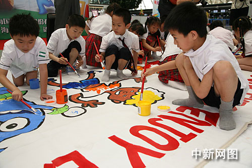 孩子們在世博主題表演中拉開了活動序幕。隨后,來自五洲四海、有著不同的膚色和語言的孩子們在10米長卷上現(xiàn)場繪畫,他們用靈巧的雙手畫出了世博吉祥物海寶、東方明珠、浦東機場等上海標志性建筑,用豐富的想象勾勒出心中理想的城市,用自己的小手做畫筆印在畫布上,形象、天真地詮釋了“城市,讓生活更美好”的世博主題,表達了對2010年上海世博會的期待和向往。