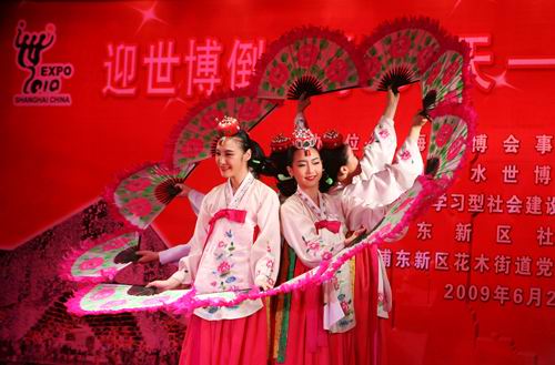 6月27日下午,上海市浦東新區(qū)花木社區(qū)文化活動中心熱鬧非凡,熱烈的掌聲和歡快的音樂聲不時地響起,由上海世博局和2012年韓國麗水世博會組委會聯(lián)合主辦、上海市學習型社會建設(shè)服務(wù)指導中心和浦東新區(qū)社區(qū)學院協(xié)辦的“迎世博倒計時300天——中韓民眾社區(qū)大聯(lián)歡”活動正在這里舉行。麗水世博會組委會秘書長金丙一、韓國駐滬副總領(lǐng)事延上模、上海世博局副局長朱詠雷、上海市學習型社會建設(shè)服務(wù)指導中心副主任王連華等出席活動。